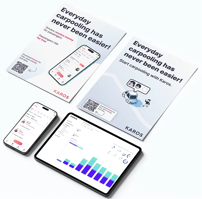 Karos combines a user-friendly commuting app with a powerful reporting platform and dedicated expert consulting. We turn individual shared rides into your systematic mobility solution.